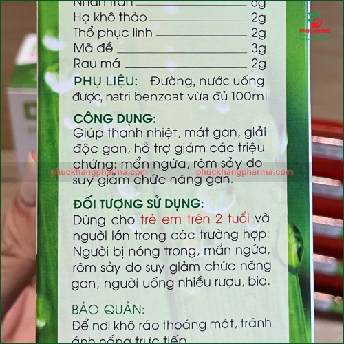 Phụ liệu: Đường, nước uống được, natri benzoat vừa đủ 100ml