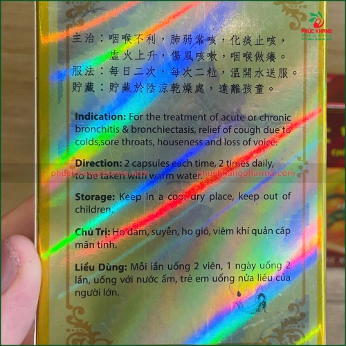 Có hướng dẫn song ngữ: tiếng Trung & tiếng Anh, và phần tiếng Việt rõ ràng về Chủ trị (Indication) , Liều dùng (Direction) , Bảo quản (Storage) như: “For the treatment of acute or chronic bronchitis & bronchiectasis… Direction: 2 capsules each time, 2 times daily… Storage: Keep in a cool dry place, keep out of children.”