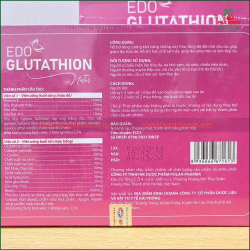 Edo Glutathion Natus là sản phẩm thực phẩm chức năng cao cấp được nghiên cứu và phát triển dành riêng cho làn da của phụ nữ Việt. Với công thức độc quyền kết hợp Glutathion 98% nồng độ cao cùng Collagen peptide, Vitamin E, và hơn 10 dưỡng chất quý hiếm, sản phẩm mang đến giải pháp toàn diện cho làn da trắng sáng, mịn màng từ bên trong. Điểm đặc biệt của Edo Glutathion Natus là thiết kế 2 viên màu sắc khác nhau (viên đỏ và viên hồng) với công dụng bổ trợ lẫn nhau, giúp tối ưu hóa hiệu quả làm đẹp da. Sản phẩm không chỉ giúp da trắng sáng tự nhiên mà còn chống lại các dấu hiệu lão hóa, mang lại vẻ đẹp tươi trẻ, rạng rỡ cho phụ nữ hiện đại.