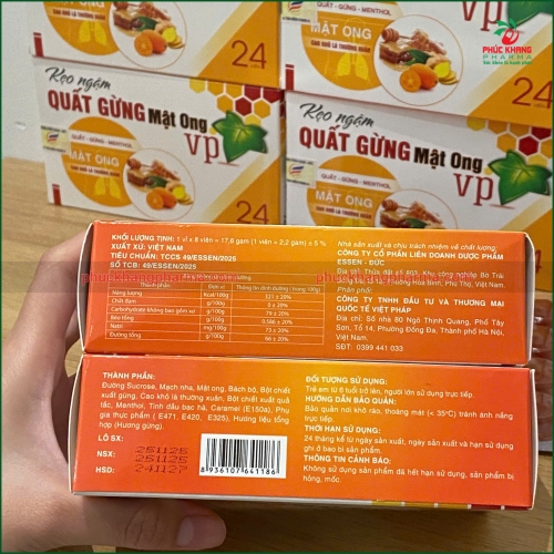 Keo ngậm Quát Gừng Mật Ong VP là sản phẩm kẹo ngậm hỗ trợ sức khỏe đường hô hấp được nhiều gia đình Việt tin dùng. Sản phẩm kết hợp hoàn hảo giữa mật ong thiên nhiên, chiết xuất gừng và các dược liệu quý như bạch bộ, khổ lá thường xuân cùng menthol mang lại cảm giác mát lạnh, dễ chịu cho vùng họng. Với công thức độc đáo từ Đông y kết hợp y học hiện đại, keo ngậm không chỉ giúp giảm ho, long đờm mà còn hỗ trợ làm dịu cơn đau rát họng hiệu quả. Sản phẩm có hương vị thơm ngon, dễ sử dụng, phù hợp cho cả trẻ em và người lớn khi gặp các vấn đề về đường hô hấp. Đây là giải pháp tự nhiên, an toàn giúp bạn nhanh chóng lấy lại giọng nói khỏe khoắn và cảm giác thoải mái ở vùng cổ họng.