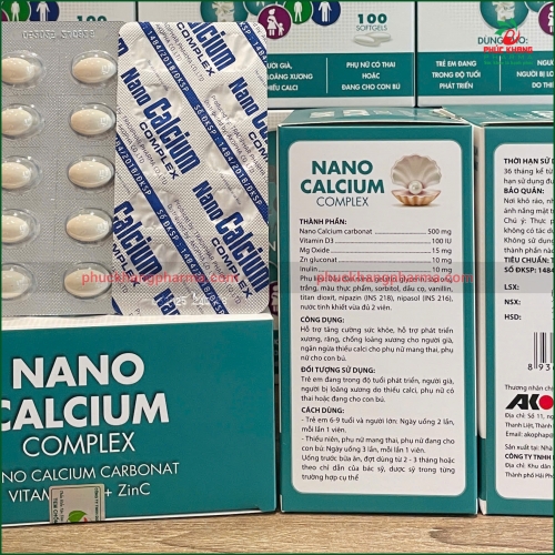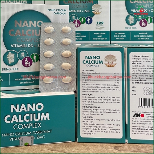 ✅ Logo và thương hiệu: Có logo "NANO CALCIUM COMPLEX" và logo công ty AKO Pharma rõ ràng trên bao bì