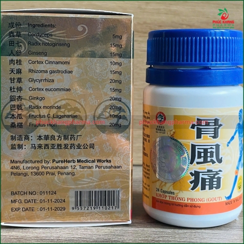 Viên Khớp Thông Phong (Gout) là sản phẩm đông y truyền thống từ Malaysia, được nghiên cứu dựa trên bài thuốc cổ truyền trong "Bản Thảo Lương Phương Cốt Phong Thống" - một trong những y thư nổi tiếng về điều trị bệnh xương khớp. Sản phẩm kết hợp 11 vị thảo dược quý hiếm như đông trùng hạ thảo, điền thất, nhân sâm, bạch quả... được chế biến bằng công nghệ hiện đại, giúp hỗ trợ điều trị hiệu quả các triệu chứng của bệnh Gout và các bệnh lý xương khớp khác.