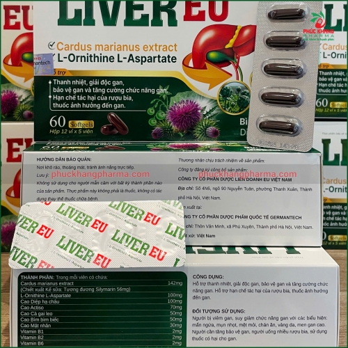 LIVER EU được bào chế từ công thức độc quyền kết hợp Cardus marianus extract (Silymarin 56mg) với L-Ornithine L-Aspartate và các dược liệu quý như Diếp hạ châu, Atiso, Cà gai leo, Bìm bìm biếc, Mật nhân cùng vitamin nhóm B, tạo nên giải pháp toàn diện cho sức khỏe gan. Sản phẩm không chỉ giúp thanh nhiệt, giải độc gan mà còn bảo vệ tế bào gan, tái tạo tế bào gan bị tổn thương và tăng cường chức năng gan một cách hiệu quả.