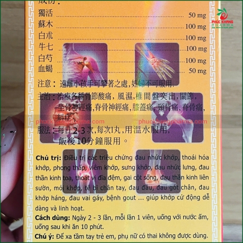 Đây là công thức truyền thống kết hợp 6 vị dược liệu quý bao gồm độc hoạt, tô mộc, bạch chỉ, ngưu thất, bạch thược, huyết kiệt... được bào chế theo phương pháp hiện đại, tạo thành một bài thuốc toàn diện giúp: