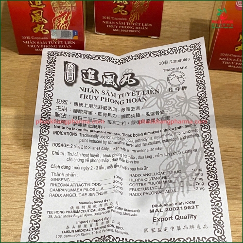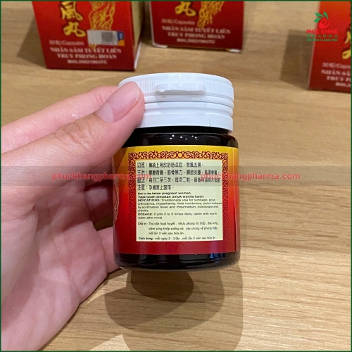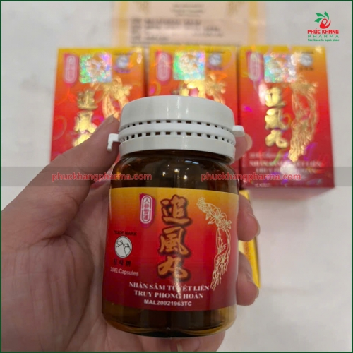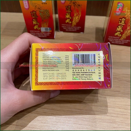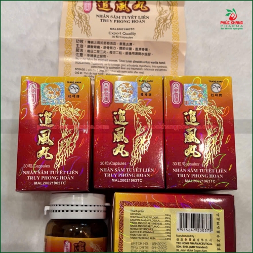 Viên Nhân Sâm Tuyết Liên Truy Phong Hoàn là sản phẩm Đông y được sản xuất bởi Yee Hong Pharmaceutical Sdn. Bhd (Malaysia) theo tiêu chuẩn GMP. Sản phẩm được bào chế từ những dược liệu quý như nhân sâm, đương quy, câu kỷ tử,... theo bài thuốc truyền thống, giúp hỗ trợ hiệu quả các vấn đề về xương khớp, đặc biệt là các triệu chứng đau nhức do phong thấp. Với thành phần tự nhiên và công thức cổ truyền, sản phẩm mang lại sự an tâm cho người sử dụng trong việc chăm sóc sức khỏe xương khớp. Truy Phong Hoàn được nhiều người tin dùng nhờ khả năng giảm đau nhanh, tăng cường sức khỏe xương khớp và cải thiện tuần hoàn máu. Đây là lựa chọn phù hợp cho những người thường xuyên vận động nhiều hoặc làm việc nặng nhọc cần bảo vệ hệ xương khớp.