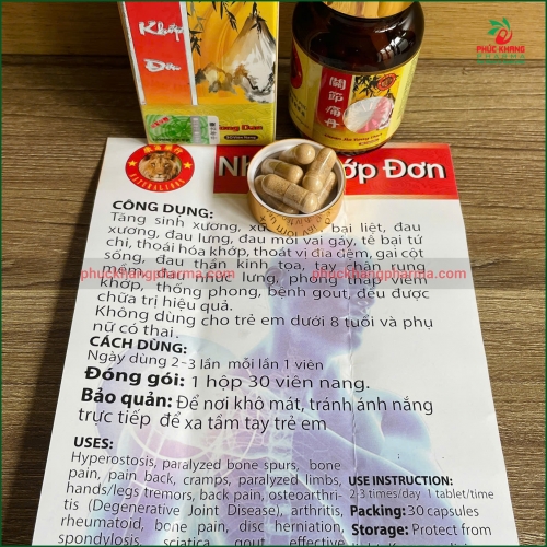 Viên Nhục Khấp Đơn là sản phẩm từ thảo dược thiên nhiên, thuộc nhóm thực phẩm chức năng hỗ trợ sức khỏe xương khớp. Sản phẩm không phải là thuốc và không có tác dụng thay thế thuốc chữa bệnh. Tuy nhiên, sản phẩm có tác dụng hỗ trợ điều trị hiệu quả khi kết hợp với phương pháp điều trị của bác sĩ.