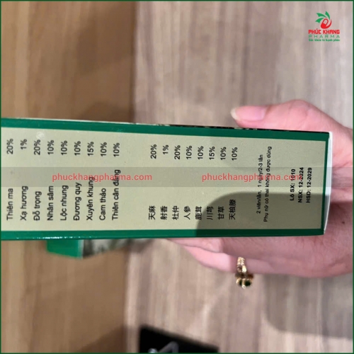 Với thành phần từ thiên ma, xạ hương, đỗ trọng, nhân sâm, lộc nhung và nhiều dược liệu quý khác, sản phẩm không chỉ giúp giảm đau mà còn nuôi dưỡng xương khớp, tăng cường sức khỏe tổng thể cho cơ thể. Đây là giải pháp tin cậy cho những ai đang tìm kiếm phương pháp hỗ trợ điều trị xương khớp từ thiên nhiên.
