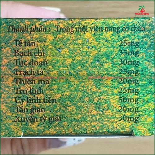 - Tế tân (細辛) - 25mg: Vị thuốc cay ấm, có tác dụng giải biểu tán hàn, khử phong chỉ đau, ôn phế hóa ẩm. Tế tân đặc biệt hiệu quả trong việc điều trị các chứng đau đầu, đau răng, đau nhức xương khớp do phong hàn thấp. Dược liệu này có khả năng xuyên thấu sâu vào kinh lạc, thông khiếu, giảm đau nhanh chóng.