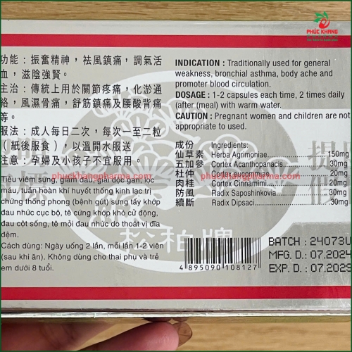 - Ngũ Gia Bì (Cortex Acanthopanacis): 30mg - Bổ gan thận, cường gân cốt, trừ ph풍 thấp, tăng cường sức đề kháng