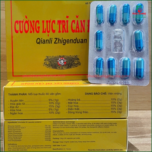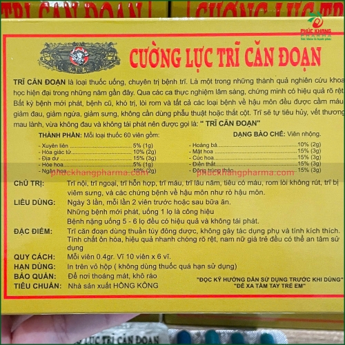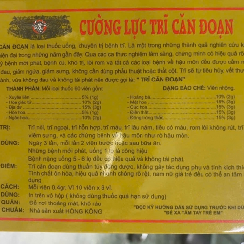 TRĨ CĂN ĐOẠN là loại thuốc uống, chuyên trị bệnh trĩ. Là một trong những thành quả nghiên cứu khoa học hiện đại trong những năm gần đây. Qua các ca thực nghiệm lâm sàng, chứng minh có hiệu quả rõ rệt. Bất kỳ bệnh mới phát, bệnh cũ, khó trị, lòi rom và tất cả các loại bệnh về hậu môn đều được cầm máu, giảm đau, giảm ngứa, giảm sưng, không cần dùng phẫu thuật hoặc thắt cột. Trĩ sẽ tự tiêu hủy, vết thương mau lành, vừa không đau và không tái phát, nên được gọi là: “TRĨ CĂN ĐOẠN”.