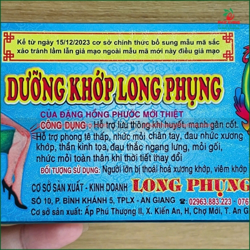 Với công thức kết hợp tinh hoa Đông y cùng dây chuyền hiện đại, Dưỡng Khớp Long Phụng mang đến hiệu quả bền vững – an toàn – không gây tác dụng phụ, thích hợp cho người cao tuổi, người lao động nặng hoặc thường xuyên đau nhức xương khớp.