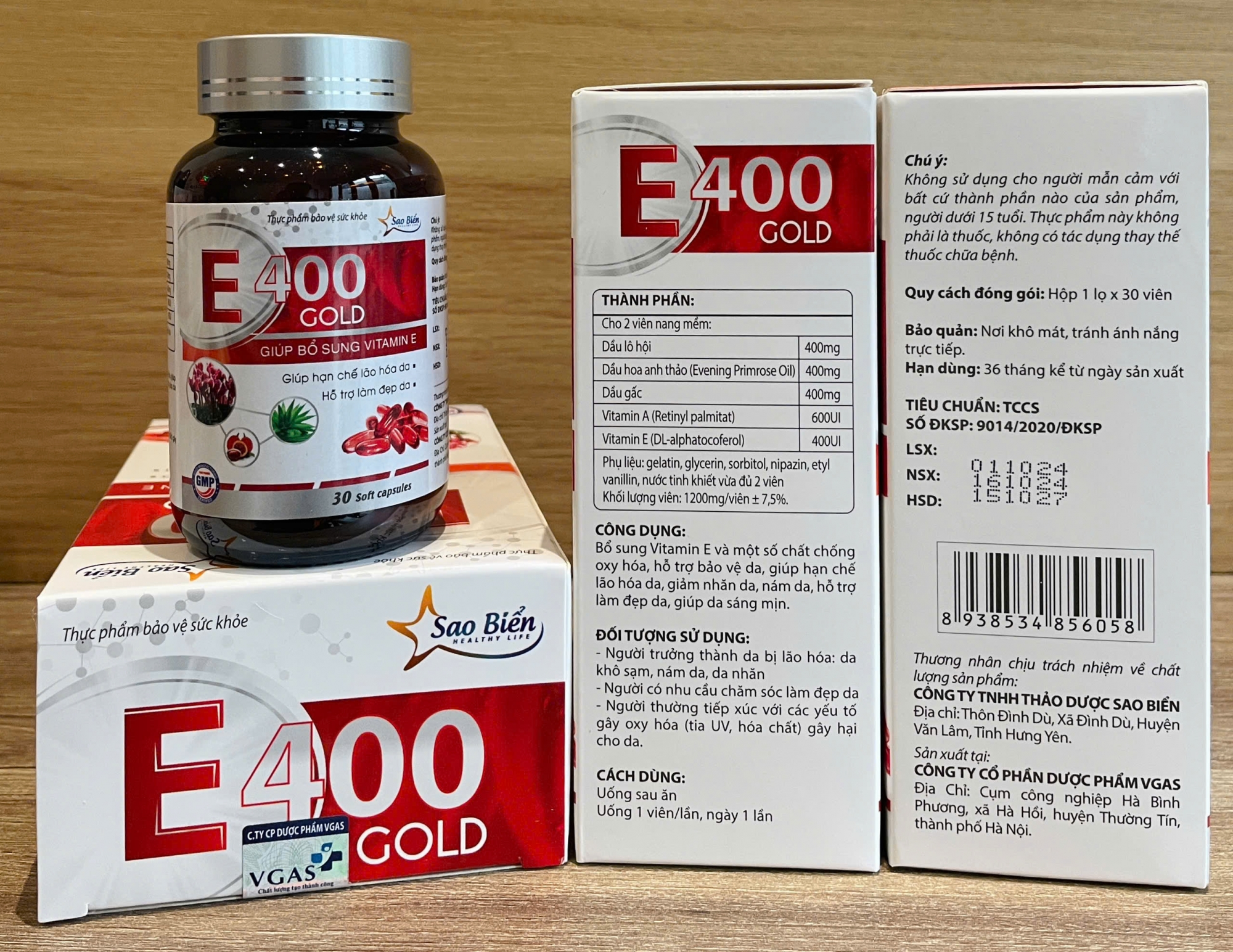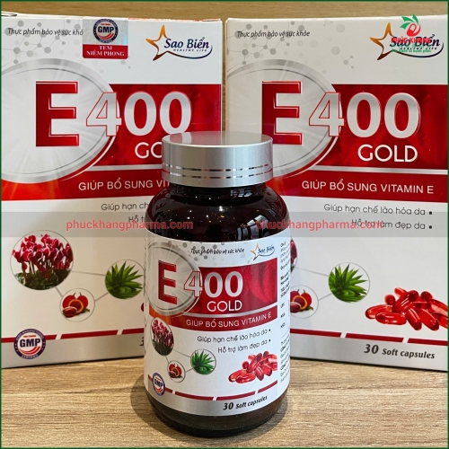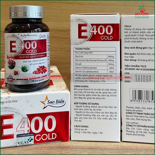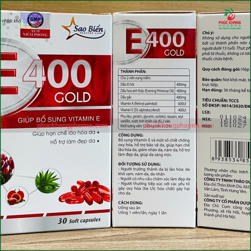 Được sản xuất bởi Công ty TNHH Thảo Dược Sao Biển với tiêu chuẩn TCCS và đã được Bộ Y tế cấp số đăng ký 9014/2020/ĐKSP, E400 Gold là lựa chọn tin cậy cho những ai mong muốn sở hữu làn da khỏe đẹp, tươi trẻ và rạng rỡ.