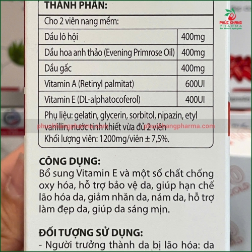 Vitamin C (D-alpha tocopherol) 400UI: Chất chống oxy hóa mạnh, giúp bảo vệ da khỏi gốc tự do, kích thích sản xuất collagen, làm sáng da, giảm thâm nám và cải thiện kết cấu da