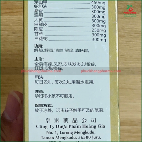 Sản phẩm được kết hợp từ nhiều thảo dược quý như Xuyên sơn giáp, Xà đàm dịch, Xạ hương, Liên kiều, Đại hoàng và Bạch hoa xà, mang lại hiệu quả toàn diện trong việc thanh nhiệt, giải độc, trừ phong thấp và dưỡng da khỏe mạnh từ bên trong.