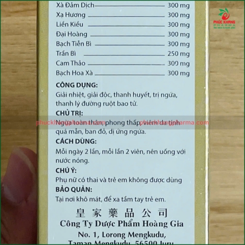 Xà đàm dịch – 300 mg: Thanh nhiệt, hóa đờm, giải độc, hỗ trợ cải thiện tình trạng viêm nhiễm dưới da.
