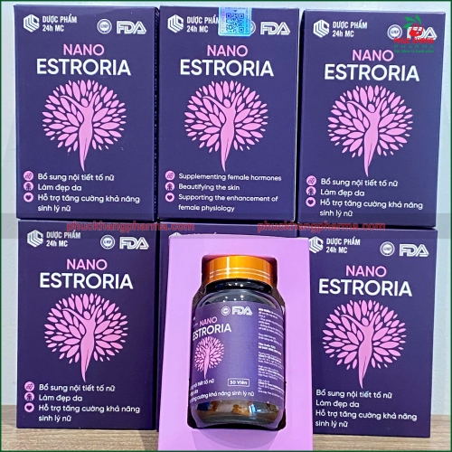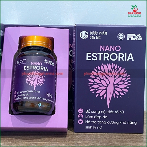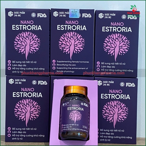Viên uống Nano Estroria là sản phẩm thực phẩm bảo vệ sức khỏe được nghiên cứu và phát triển đặc biệt dành cho phụ nữ. Sản phẩm kết hợp công nghệ Nano hiện đại với tinh hoa từ thiên nhiên, bao gồm Chiết xuất mầm đậu nành (Isoflavon 30mg) - nguồn phytoestrogen tự nhiên, Collagen Type I giúp làm đẹp da, Pueraria Mirifica (Kwao Krua) - thảo dược quý từ Thái Lan nổi tiếng với khả năng cân bằng nội tiết tố, cùng với Cao Đương Quy, Cao Bạch Thược, Bột Nhau Thai Cừu, Cao Sen Tây và nhiều dưỡng chất khác.
