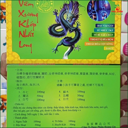 Viên Uống Xương Khớp Nhất Long là sản phẩm thảo dược hỗ trợ điều trị các vấn đề xương khớp, đau thần kinh tọa, tê bì tay chân, thoái hóa cột sống và thoát vị đĩa đệm.