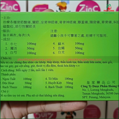 Tô Mộc (100mg): Có tác dụng giảm sưng, tiêu viêm, hỗ trợ điều trị đau nhức xương khớp.